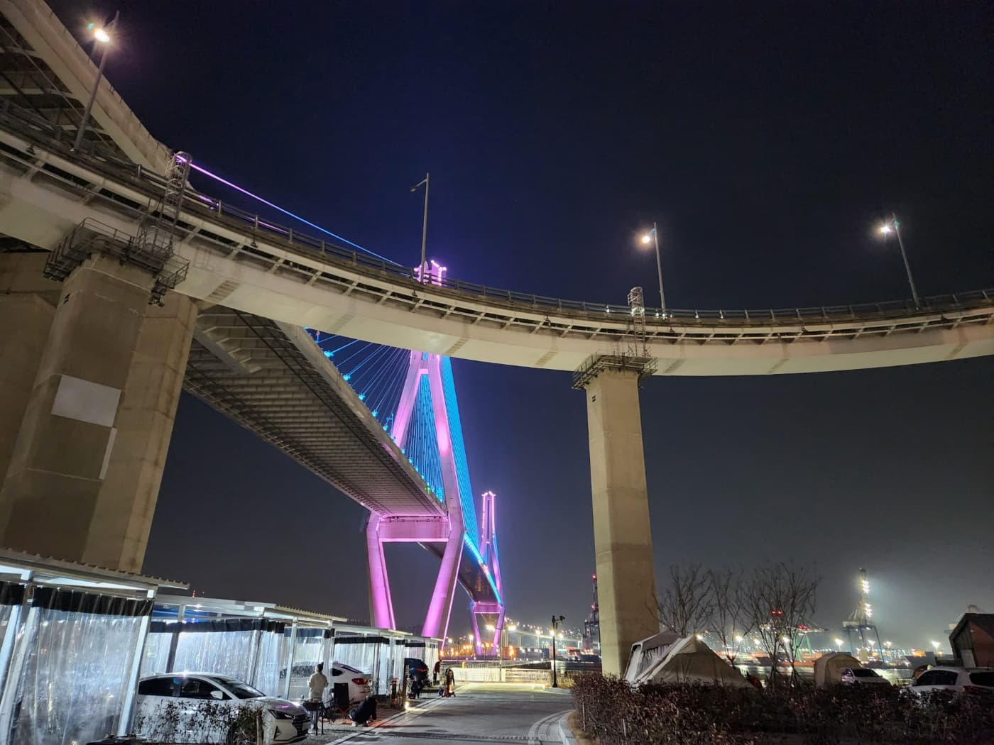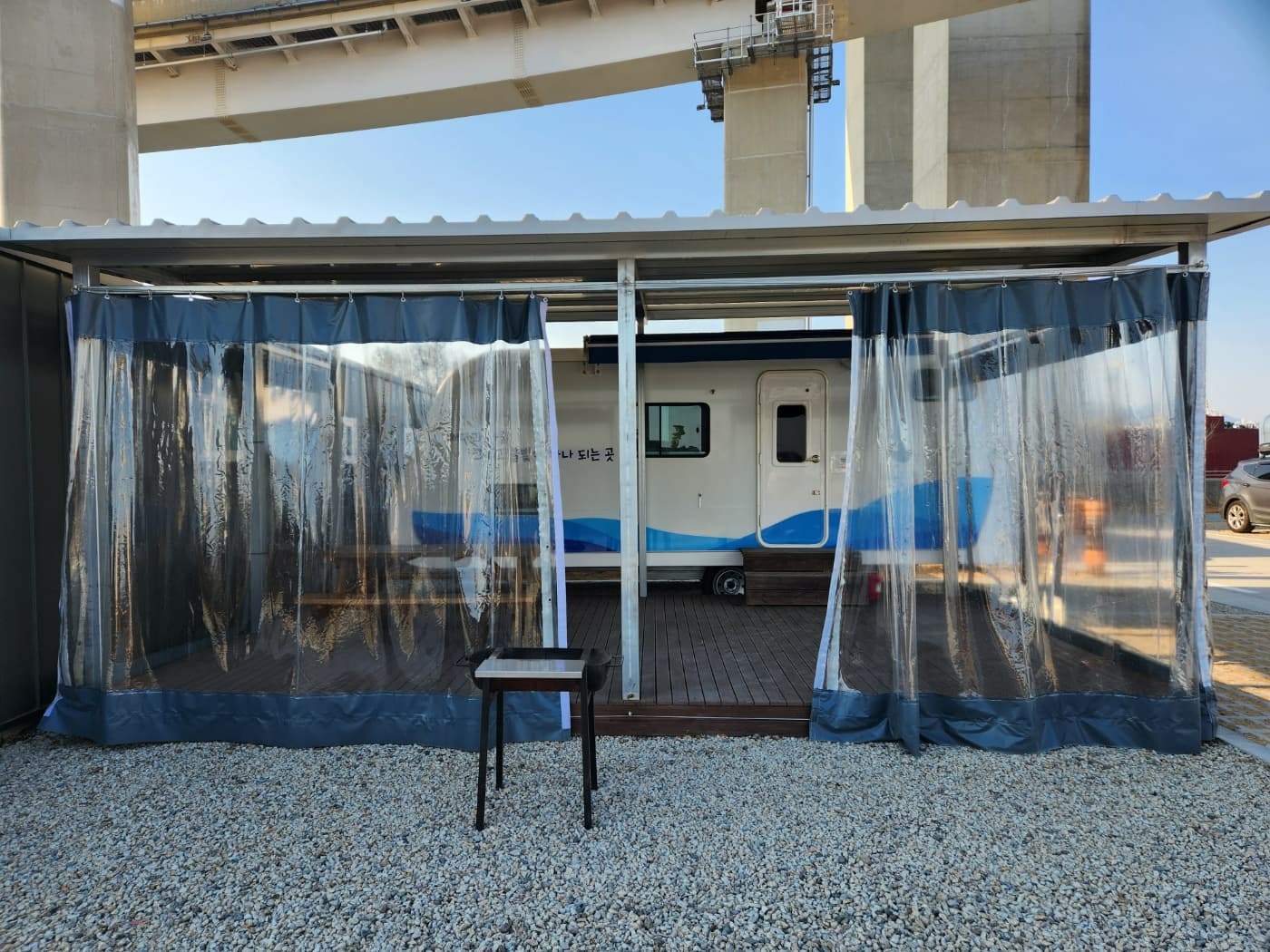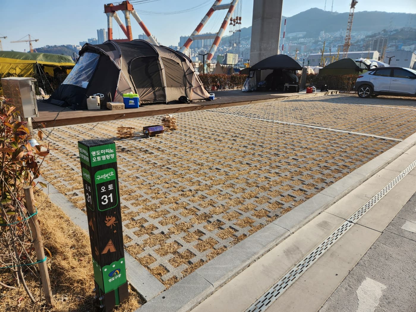 저 같은 경우에도 영도 마리노 오토캠핑장을 5번 도전 끝에 당첨이 된 것 같습니다. 그리고 일반인 추첨 예약 전에 영도구민의 우선 추첨 예약이 진행되기 때문에 구민이 먼저 예약을 한 자리 이외의 자리에 일반인이 예약을 할 수 있습니다. 부산항 대교 밑에서 교량 야경을 보면서 불멍을 하면서 재밌게 잘 놀다 왔네요. 카라반 옆으로 비닐 천막이 별도 설치되어 있어서 겨울이지만 춥지 않게 캠핑을 즐길 수 있었습니다. 캠핑장 내에 매점은 없고 캠핑장 나가셔서 도보로 갈 수 있는 거리에 GS편의점이 있었고, 장착은 1만 원으로 24시간 판매 중이었습니다.