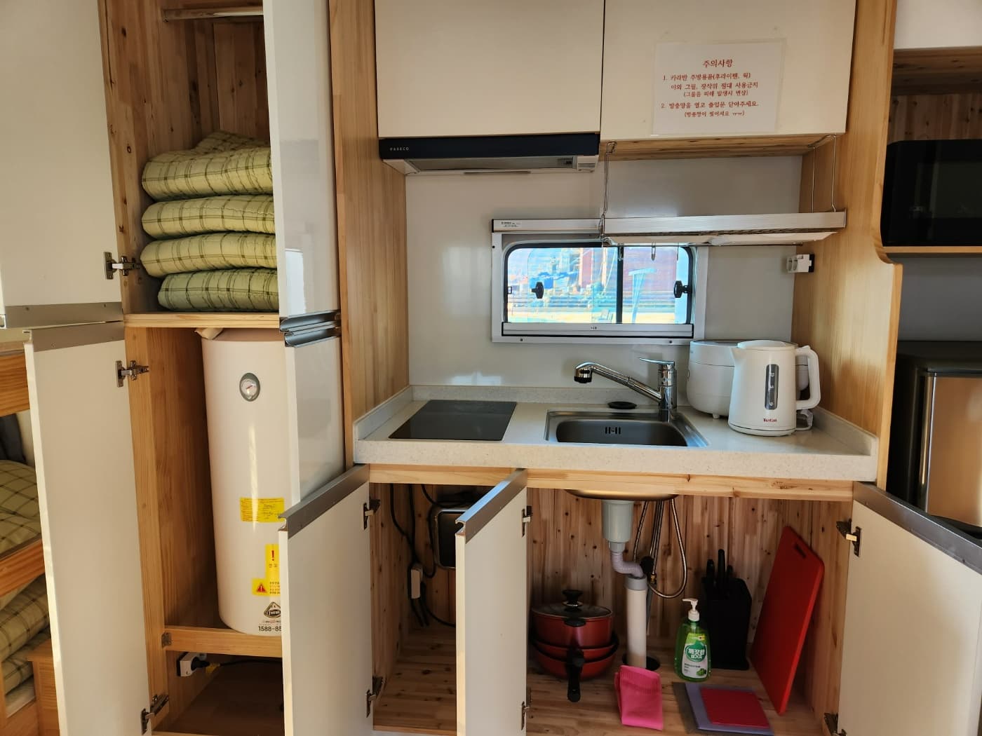 영도 마리노 오토캠핑장의 전경은 배가 정착되어 있는 옛날의 영도 모습을 볼 수 있고, 또 한쪽으로는 북항의 모습을 한눈에 볼 수 있었습니다. 제가 이용한 카라반은 4인용으로 침실과 화장실, 주방으로 이루어져 있었습니다. 침구나 식기 등 갖가지 기구들이 깨끗했고, 얼마 사용이 안된 모습이었습니다. 세부적으로는 작은 냉장고와 TV, 전자레인지, 커피포트, 주방용품들이 구비되어 있었고, 수건이나 휴지 등 개인위생도구나 세면도구는 비치되어 있기 않기 때문에 챙겨가셔야 합니다. 심지어 주방세제나 수세미도 구비되어 있어서 편리하게 이용할 수 있었습니다.
