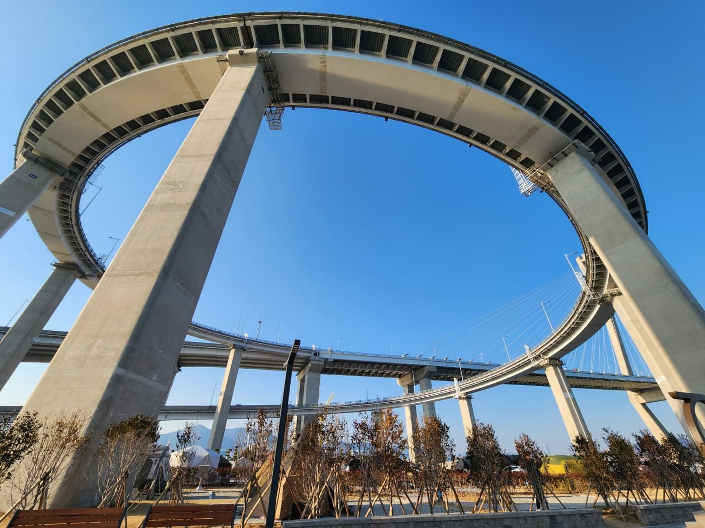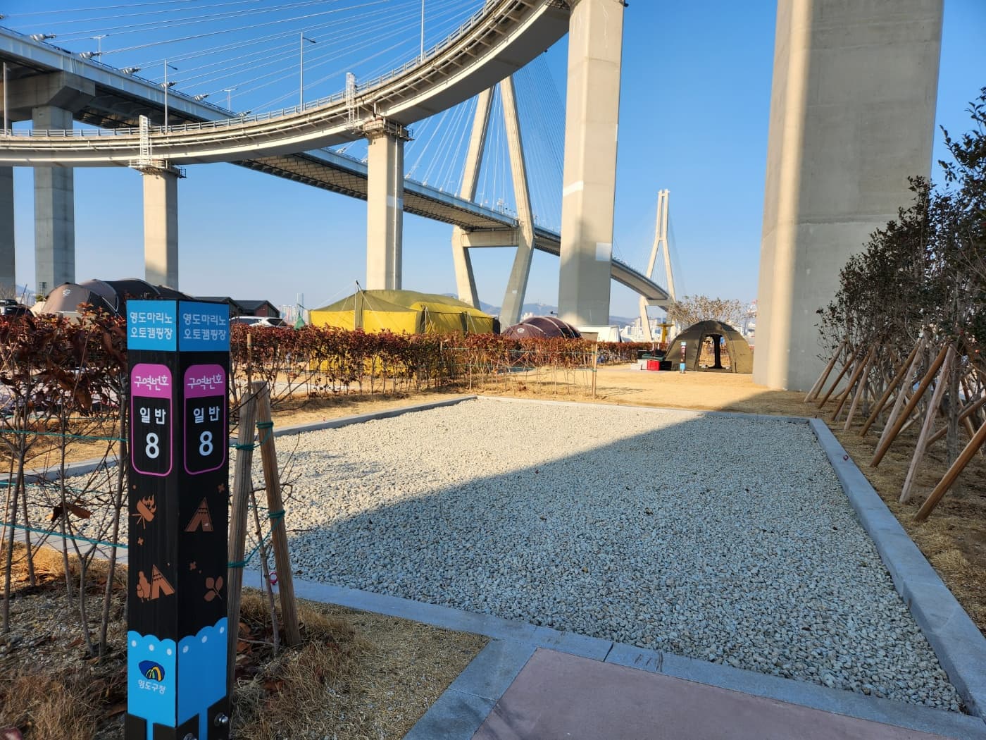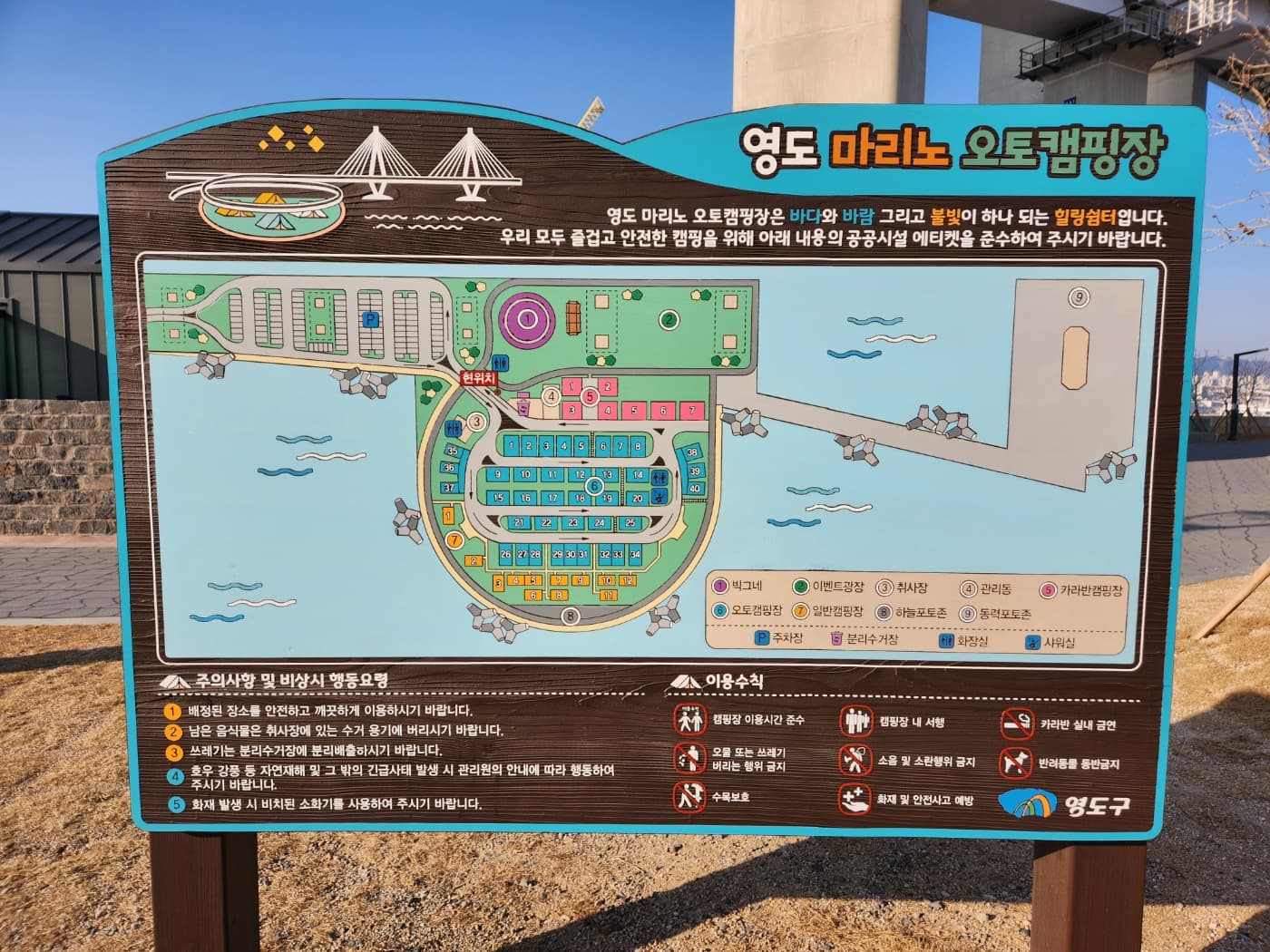 영도 마리노 오토캠핑장은 부산항대교 하부 공간에 조성된 캠핑장으로 롤러코스트 같이 램프 밑에서 올라가는 차량도 구경할 수 있고 바다를 바로 눈앞에서 볼 수 있기 때문에 전경이 아주 좋은 캠핑장이기도 합니다. 캠핑장 둘레로는 가볍게 10분 정도 산책할 수 있는 코스도 마련되어 있기 때문에 경치 좋은 바다를 보면서 산책을 해보는 것도 추천드리고 싶네요. 이런 곳에 캠핑장을 만들 생각을 한 것 정말 대단한 신의 한 수가 아닌가 생각이 드네요. 다만, 태풍이나 비가 많이 오면 위험하기 때문에 캠핑장 이용이 제약사항이 있을 것 같네요.