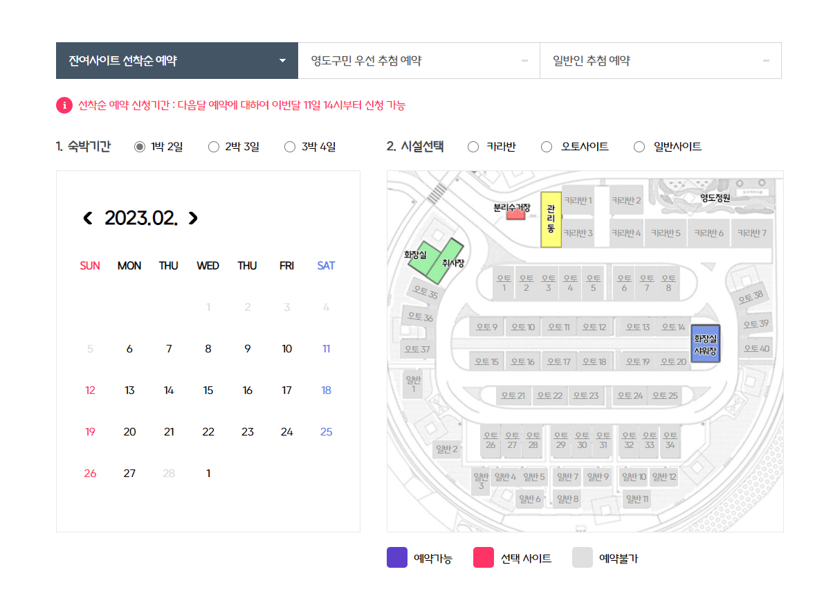 영도 마리노 오토캠핑장은 홈페이지에서 추첨제로 예약을 할 수 있는 선택권이 주어지는데요, 다음 달 예약을 정해진 기간에 1인 1개 신청을 할 수 있고, 추첨을 다하고 나서 미계약 된 잔여자리에 한하여 선착순 예약을 진행합니다. 주말의 경우 잔여사이트는 거의 찾아보기가 힘들기 때문에 추첨을 할 때 경쟁률이 낮은 자리를 선택해서 당첨을 기다리는 방법이 좋을 것 같습니다. 카라반은 7개, 오토사이트는 34개, 일반 사이트는 11개로 구성되어 있고, 명당자리는 부산항과 바다를 바로 볼 수 있는 오토 38~40번 자리라고 하네요. 제일 경쟁이 치열한 자리입니다.